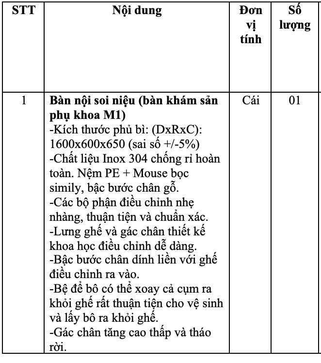 Phòng Vật tư – Thiết bị y tế mời báo giá Mua sắm Bàn nội soi niệu (Bàn khám sản phụ khoa M1)