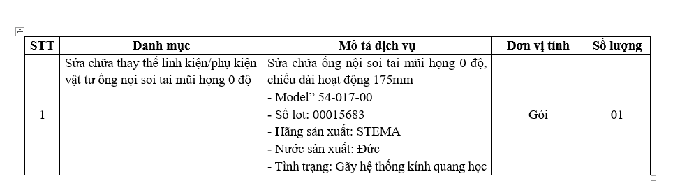 Phòng Vật tư – thiết bị y tế mời báo giá Sửa chữa thay thế linh kiện/phụ kiện vật tư ống nội soi tai mũi họng 0 độ