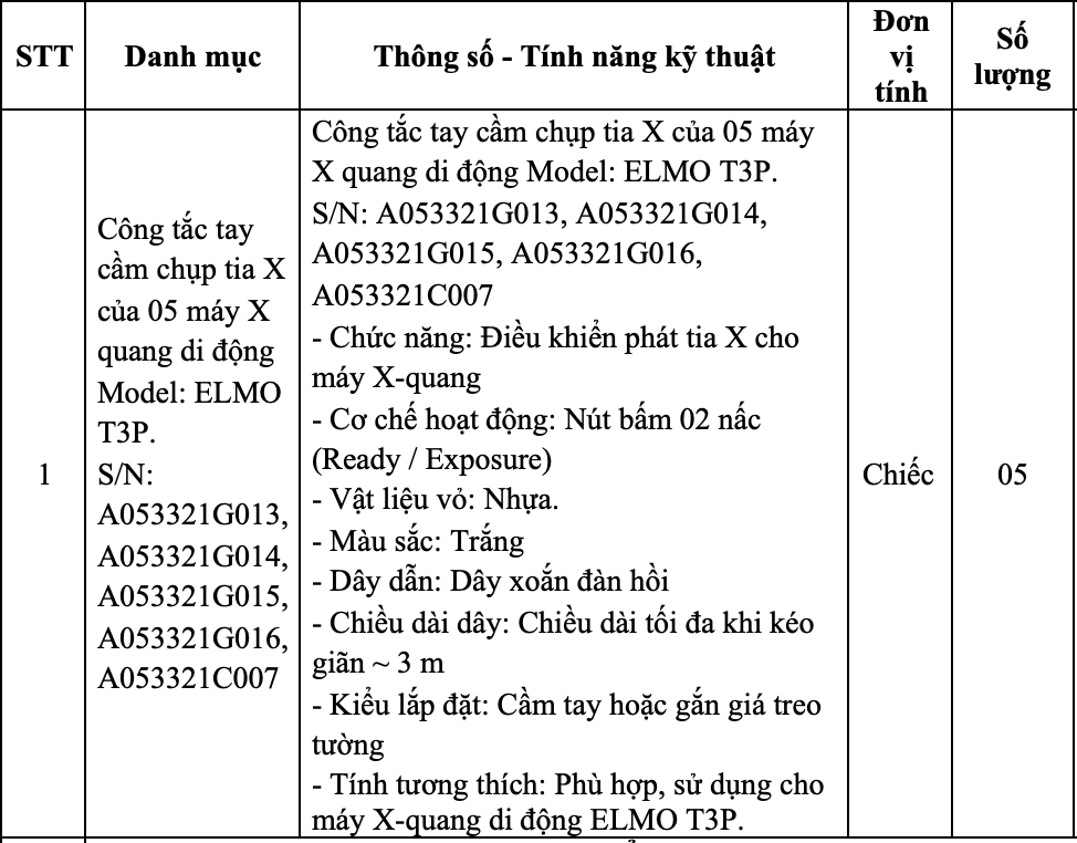 Phòng Vật tư – thiết bị y tế mời chào giá Công tắc tay cầm chụp tia X của 05 máy X quang di động Model: ELMO T3P