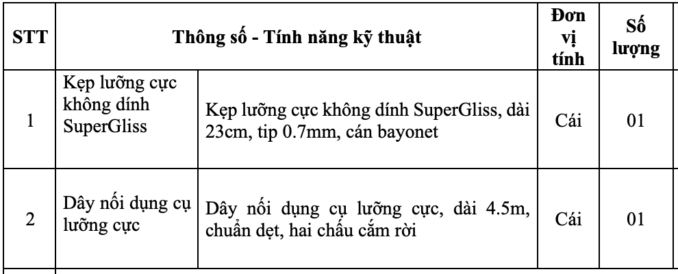 Phòng Vật tư – thiết bị y tế mời chào giá Kẹp lưỡng cực không dính SuperGliss và Dây nối dụng cụ lưỡng cực