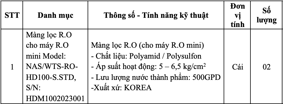 Phòng Vật tư – thiết bị y tế mời chào giá Màng lọc R.O cho máy R.O mini Model: NAS/WTS-RO-HD100-S.STD, S/N: HDM1002023001