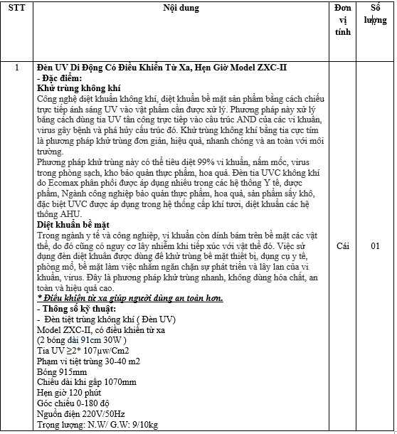 Phòng Vật tư – thiết bị y tế mời chào giá mua sắm Đèn UV di động có điều khiển từ xa