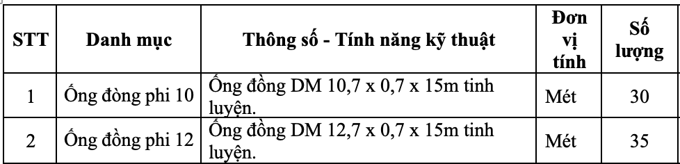 Phòng Vật tư – thiết bị y tế mời chào giá Ống đồng phi 10 và Ống đồng phi 12